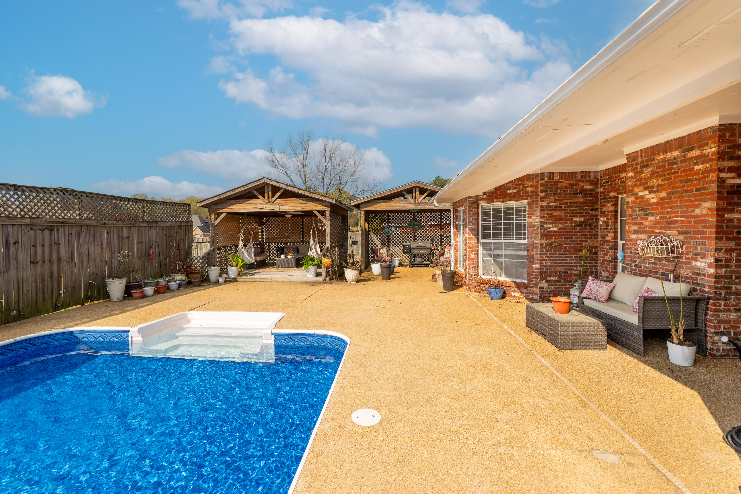 Don't miss this beautiful 4-bedroom, 3.5-bath home with playroom & office, and did someone say POOL!?!? Truly a must see. With over 2800 sq ft, you'll have plenty of room to spread out. Features include high ceilings, tray ceilings, crown molding, granite, abundant storage, energy-efficient windows, and so much more! There's also plenty of back patio space and a cozy cabana to relax by the pool. All back yard toys & equipment + shed remain. Lastly, there's a raised bed for gardening already in place.
